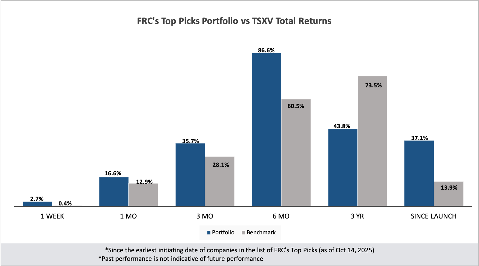 Our top picks have outperformed the benchmark (TSXV) in five out of six time periods listed below.