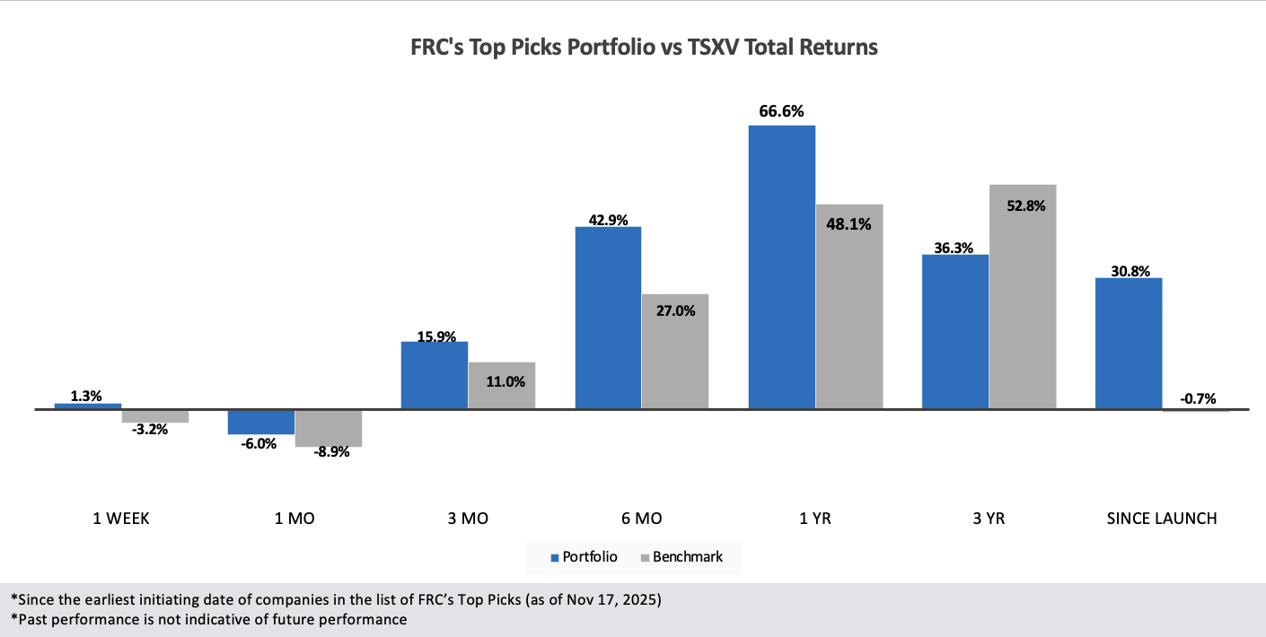 Our top picks have outperformed the benchmark (TSXV) in six out of seven time periods listed below.