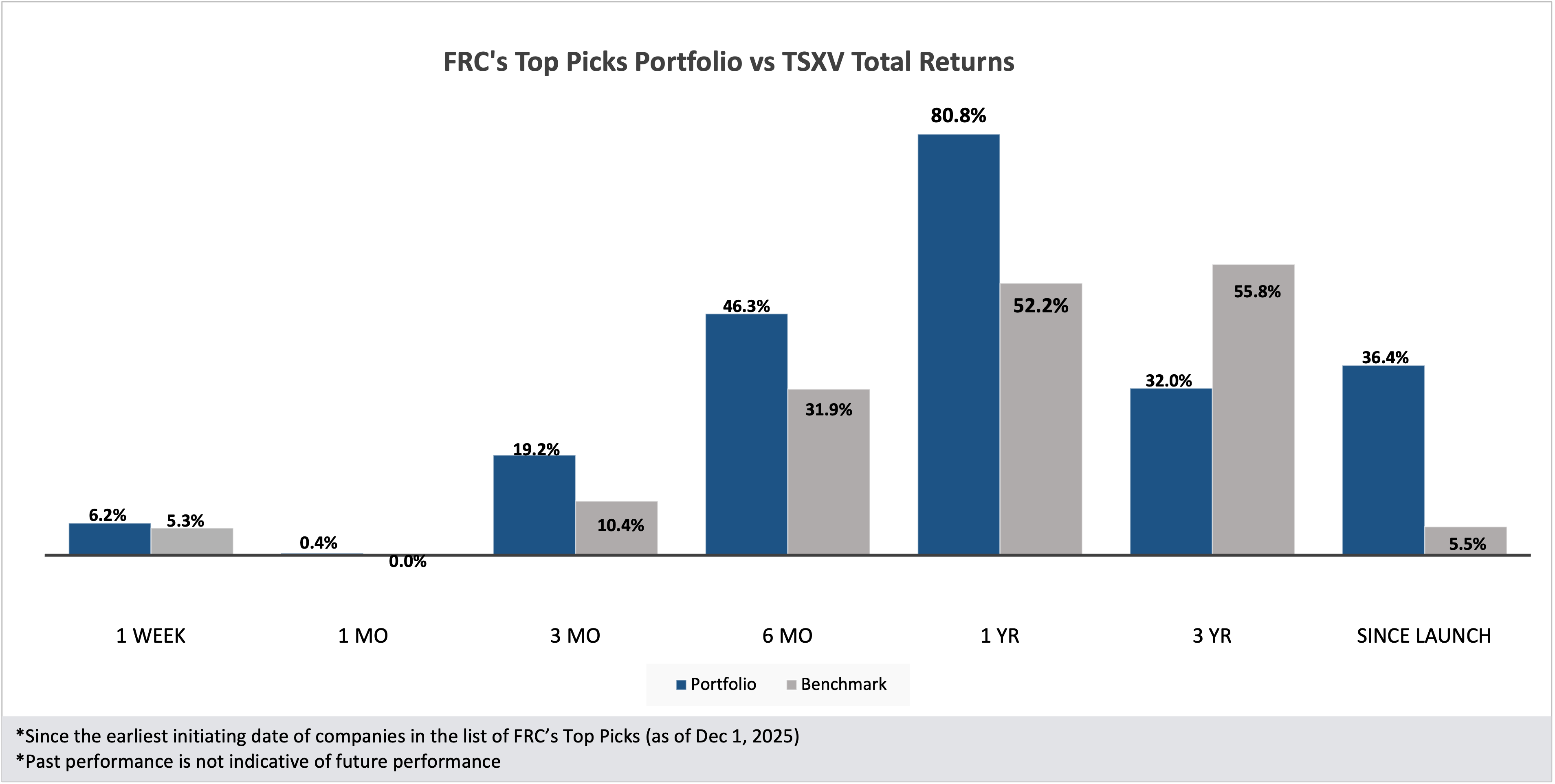 Our top picks have outperformed the benchmark (TSXV) in six out of seven time periods listed below.