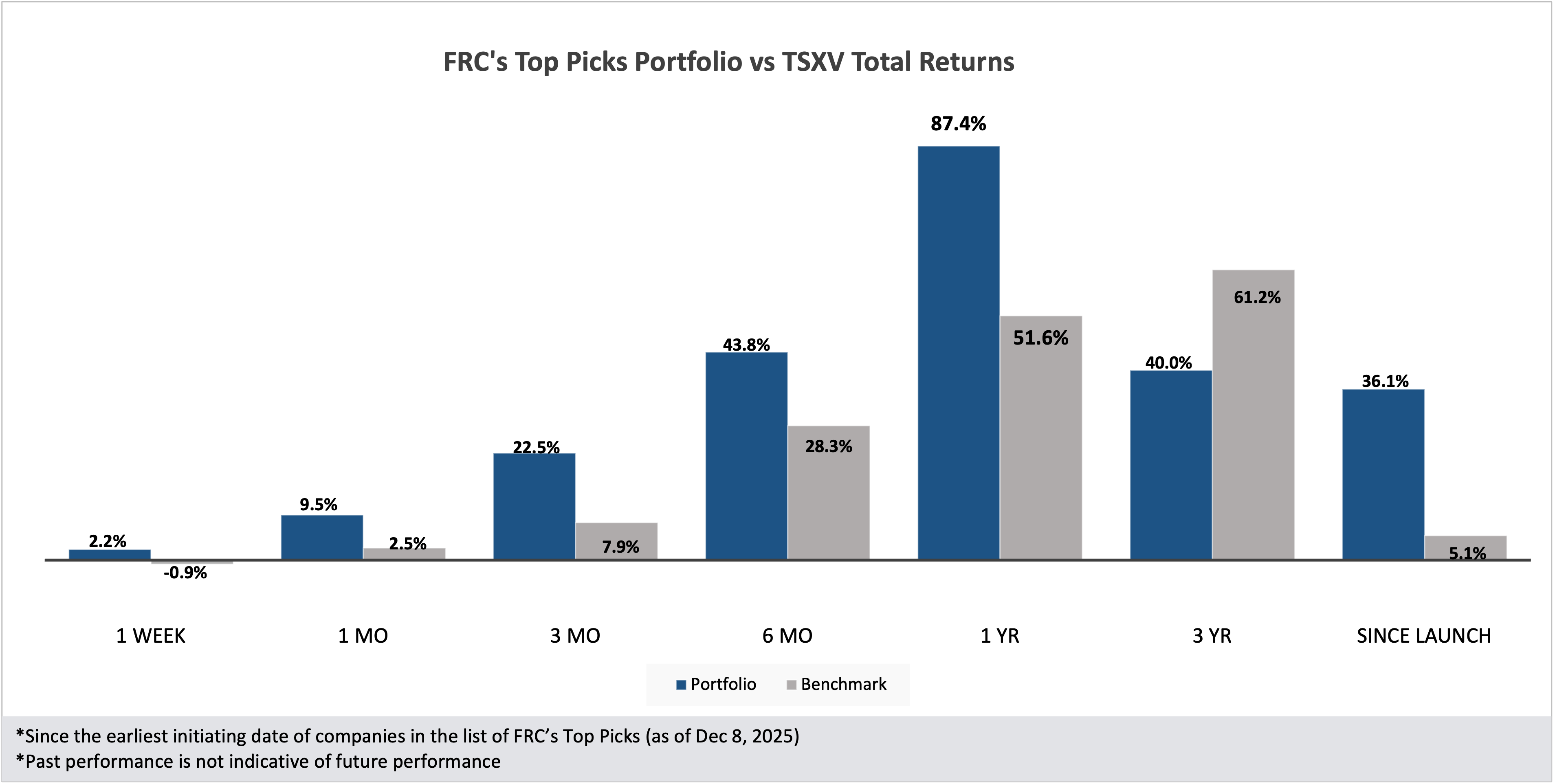 Our top picks have outperformed the benchmark (TSXV) in six out of seven time periods listed below.