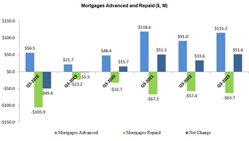 Loan advancements were up 27% YoY; repayments were up 11% YoY and Net mortgages outstanding were up 6% QoQ