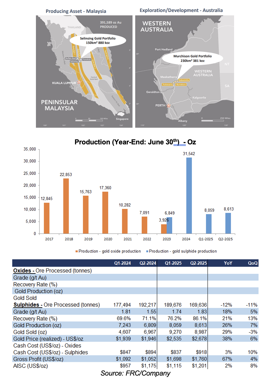 Owns a producing gold mine in Malaysia, and exploration projects in Western Australia. Total compliant resources of over 1.2 Moz Au