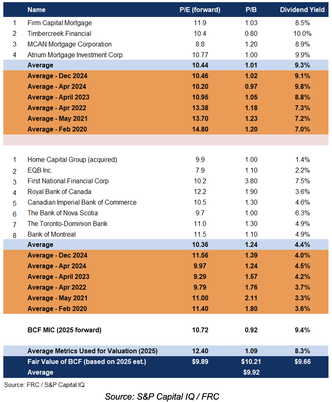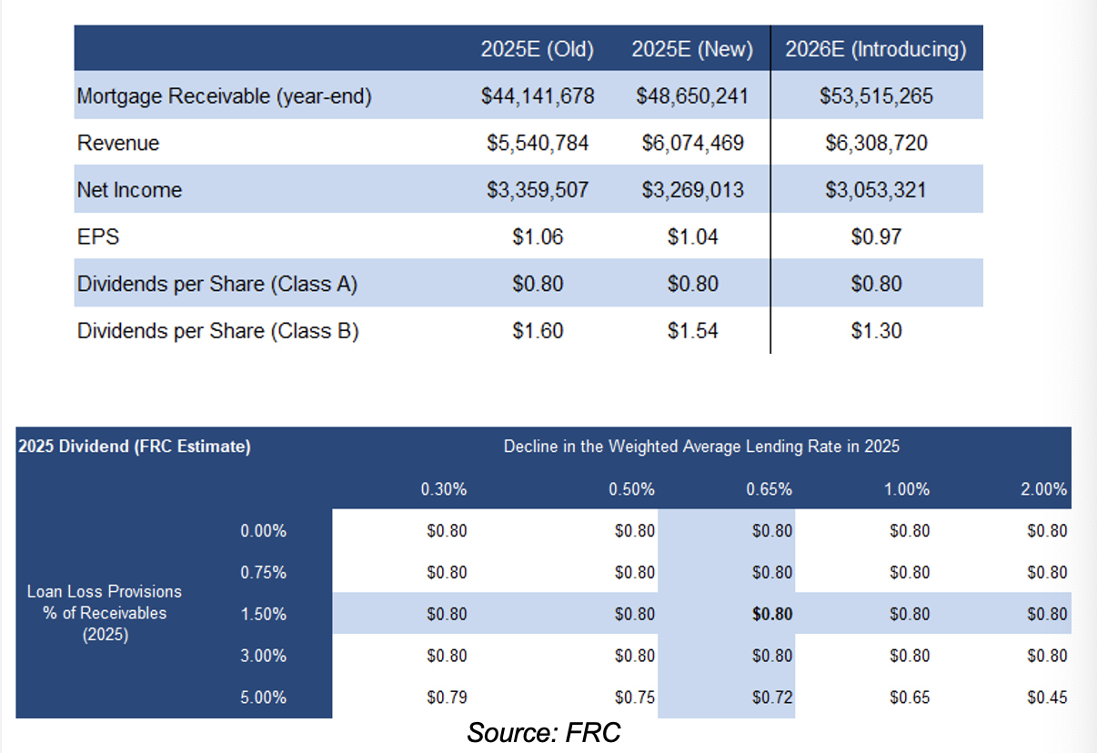 We are reiterating our BUY rating, and adjusting our fair value estimate from $10.13 to $9.92/share, implying an expected return of 25% (including dividends) in the next 12 months. BCF's 2024 financials largely aligned with our expectations. Although lower interest rates have historically benefited MIC/financial stocks, current geopolitical uncertainties, trade disputes, and the looming threat of a tariff-driven economic downturn are creating headwinds for the broader Canadian equity market. As illustrated in the sensitivity table above, BCF’s ability to sustain its dividend in stressed scenarios is a key strength.