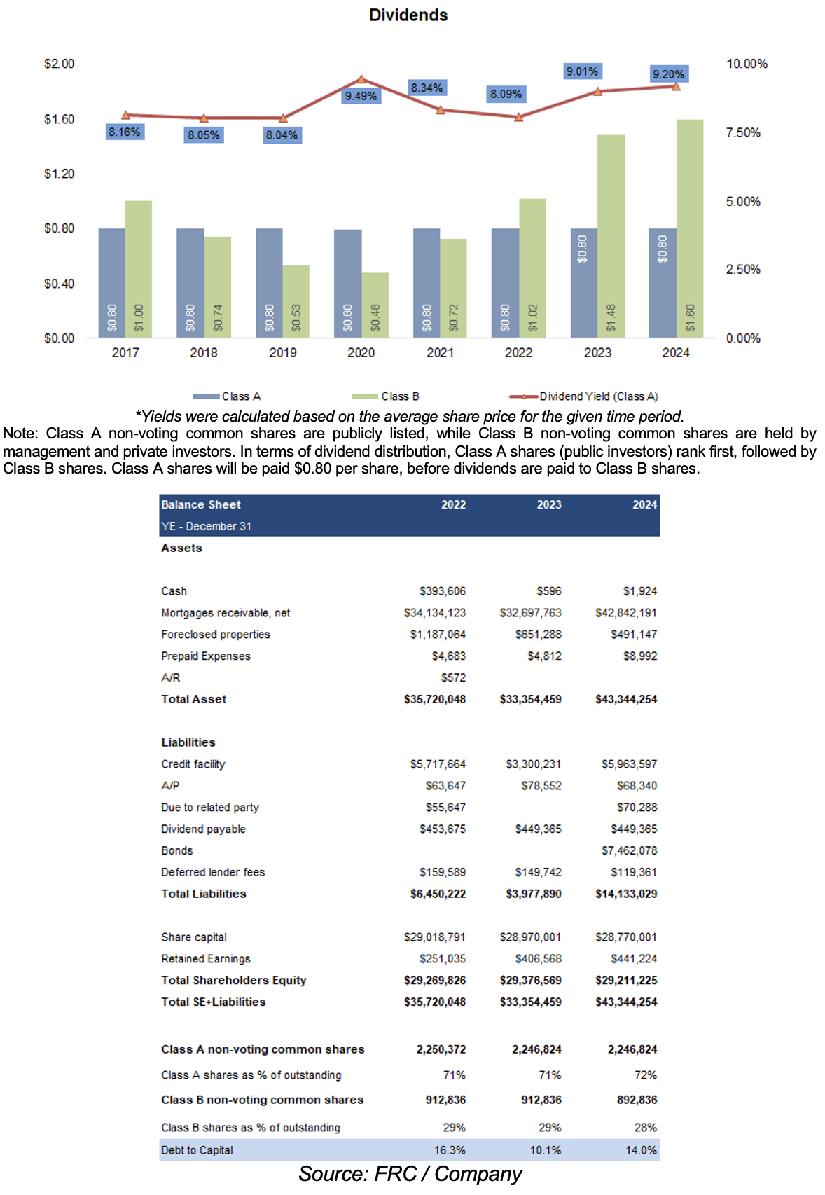 Dividends for Class A investors remained unchanged at $0.80/share, implying a yield of 9.36