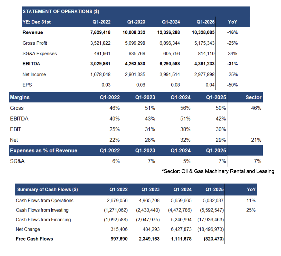 Q1-2025 revenue and EPS were down YoY due to a large one-time client gas project that boosted Q1-2024.