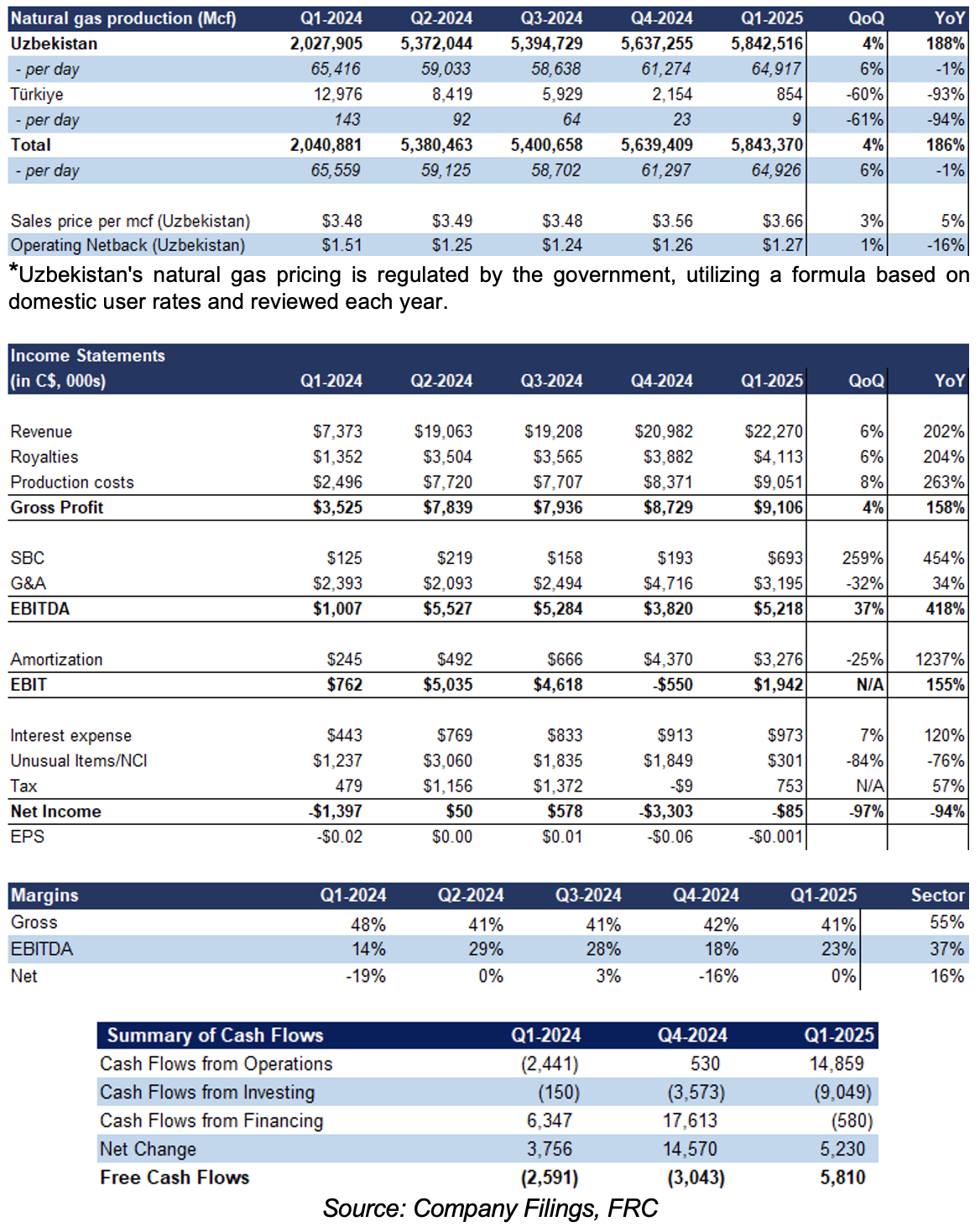 In Q1-2025, nearly all of CDR’s output came from its Production Enhancement Contract (PEC) with the Government of Uzbekistan, which commenced in Q1-2024.