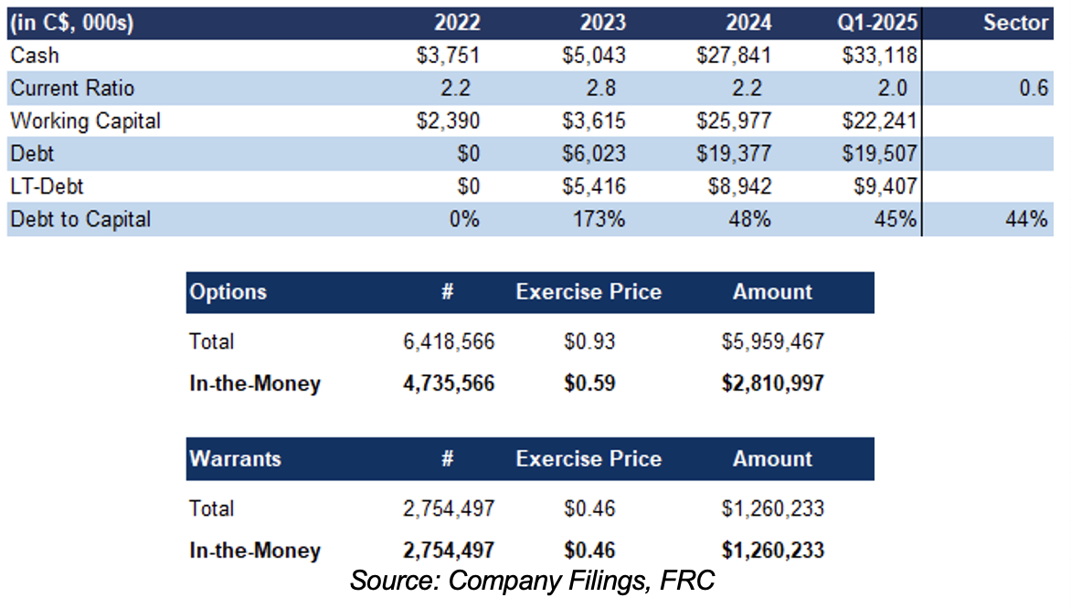 Debt-to-capital declined, moving closer to the sector average. Can raise up to $4M from in-the-money options and warrants