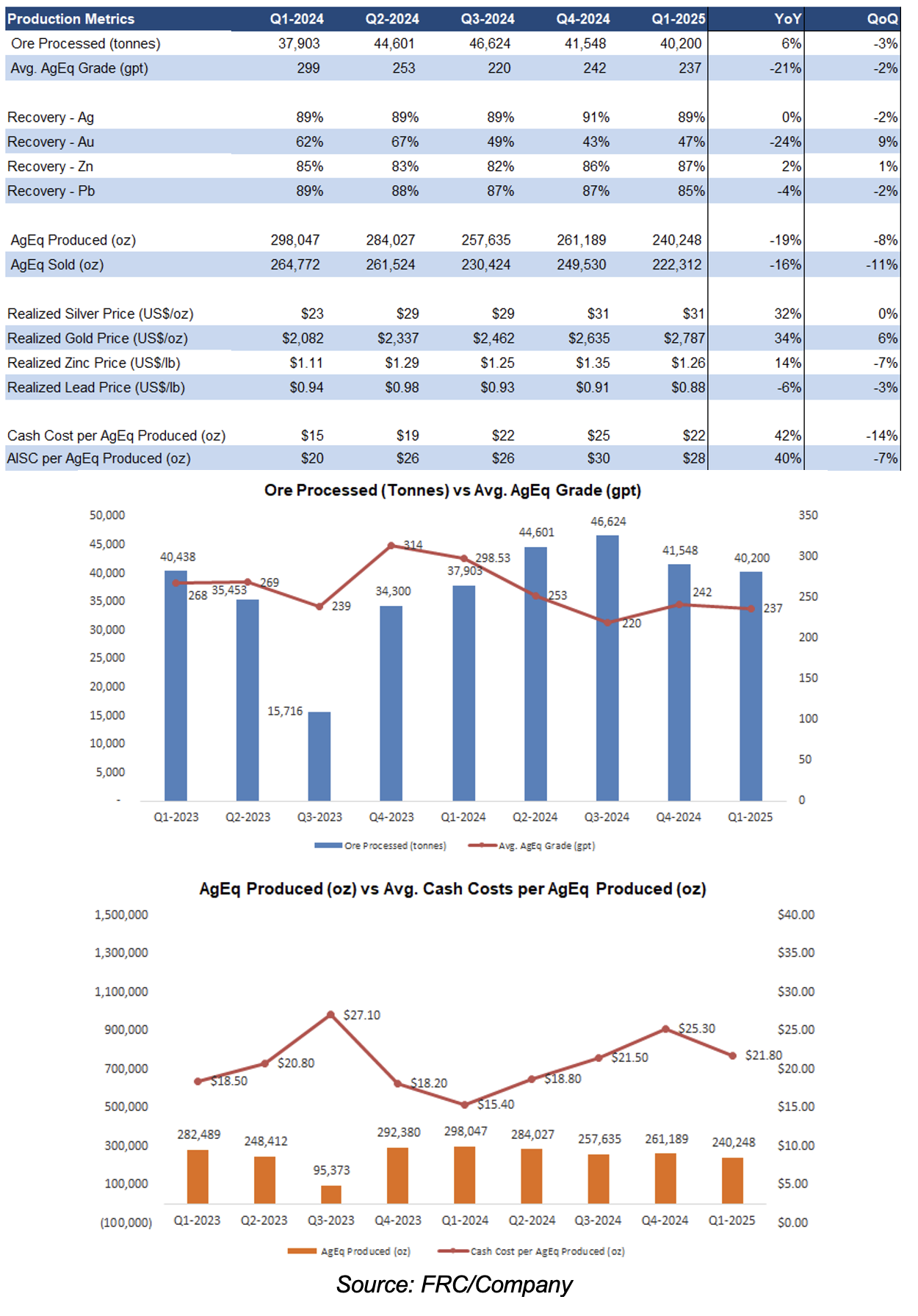 While Q1 production was weaker than expected, lower cash costs helped offset the impact. Metal prices were relatively flat QoQ. Recovery rates were relatively stable