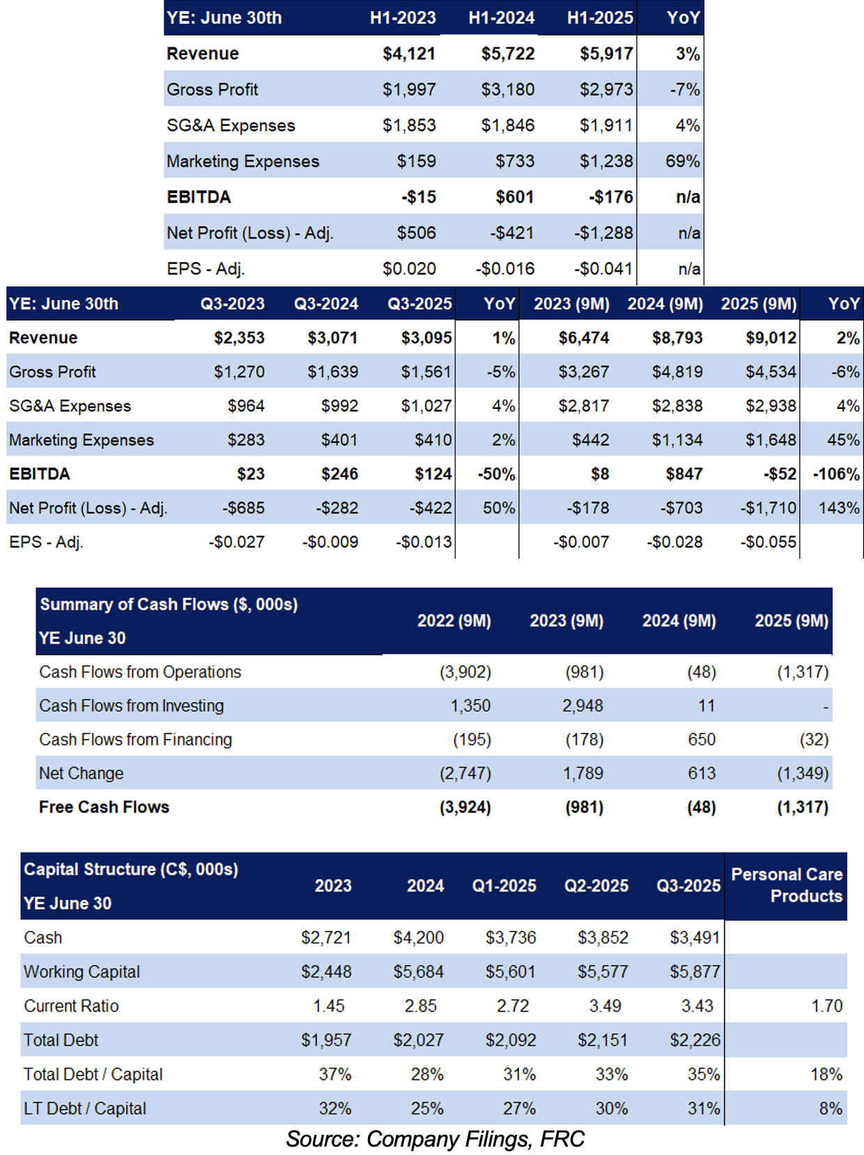 Canadian revenue continues to be impacted by softer sales of cannabis-infused LivRelief topical creams; management is currently developing a renewed marketing strategy to revitalize sales of these products. Gross margins were down 3 pp, driven by a higher proportion of low-margin product sales, missing our estimate by 1 pp
