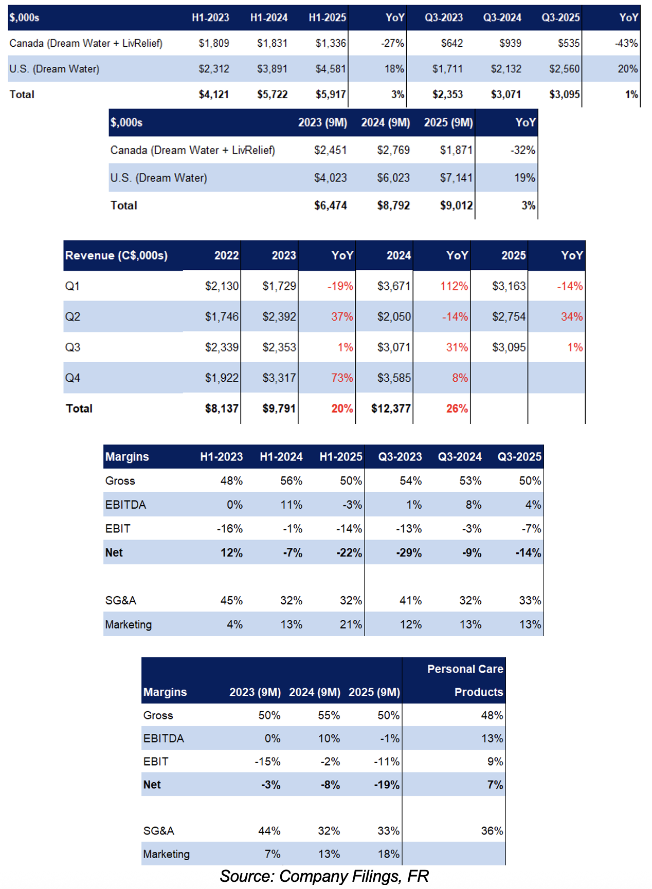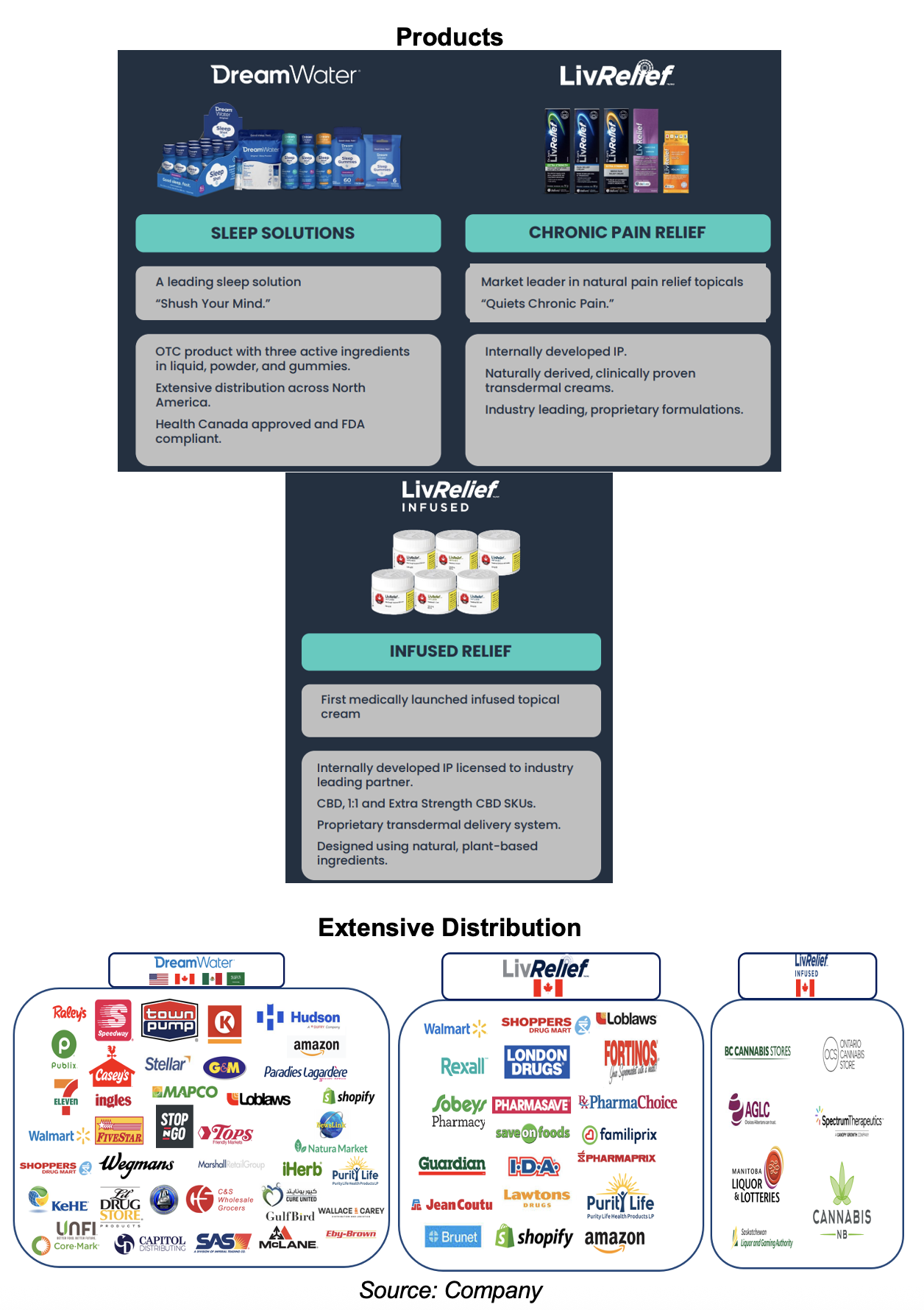 Follows an asset-light model by outsourcing manufacturing and packaging to entities in North America. Two Primary Brands: Dream Water (sold in the U.S./Canada/the Middle East), and LivRelief (sold in Canada)