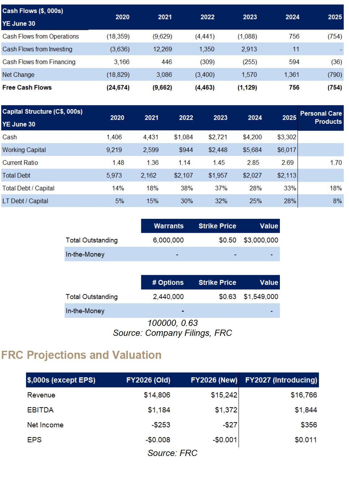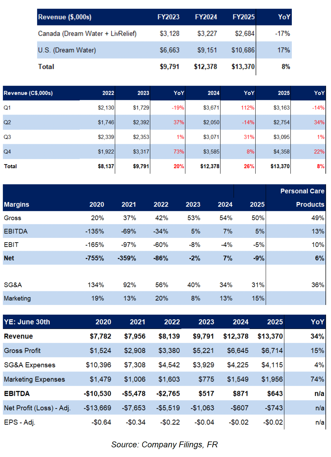 FY2025 revenue rose 8% YoY, beating our estimate by 3%, due to stronger than expected Dream Water sales in the U.S., and Middle East. Canadian revenue remains pressured by softer sales of cannabis-infused LivRelief topical creams, with management developing a refreshed marketing strategy to boost performance