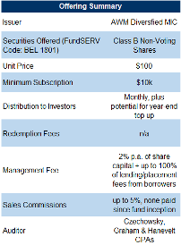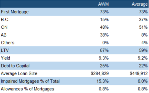- AWM maintains its spot as one of the larger Mortgage Investment Corporations (MICs) in Canada, focused on first/second mortgages on single family residential units.