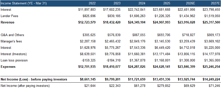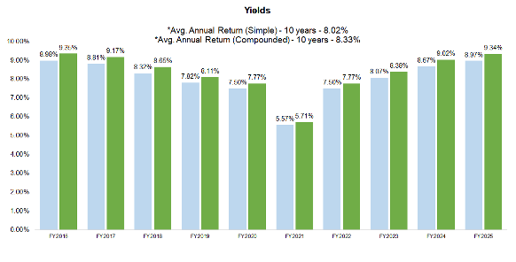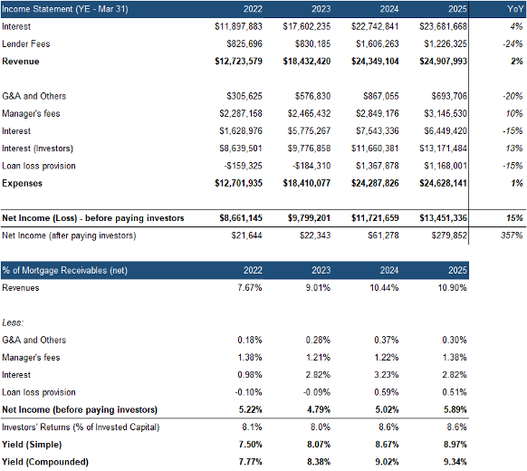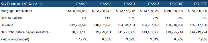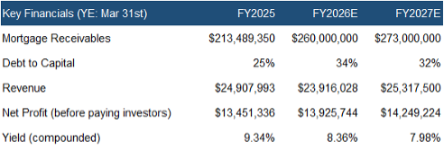 - In FY2025 (ended March 2025), net income (before investor distributions) rose 15% YoY to $13.45M, nearly matching our estimate of $13.48M. The yield (compounded) increased from 9.02% in FY2024, to 9.34% in FY2025 vs our forecast of 9.39%.