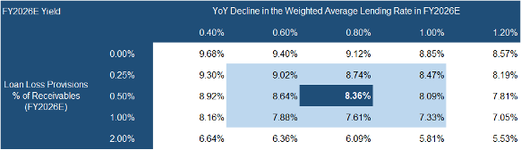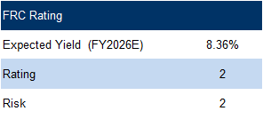- Outlook: We project a yield of 8.36% in FY2026 vs. 9.34% in FY2025.