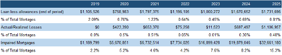 - At the end of FY2025, the MIC had $33M (15% of the portfolio vs the sector average of 6%) in impaired mortgages, up from $20M (8% of the portfolio) at the end of FY2024. While sector impairments also increased YoY, the rise was more moderate at 25%, versus the MIC’s 65% increase.