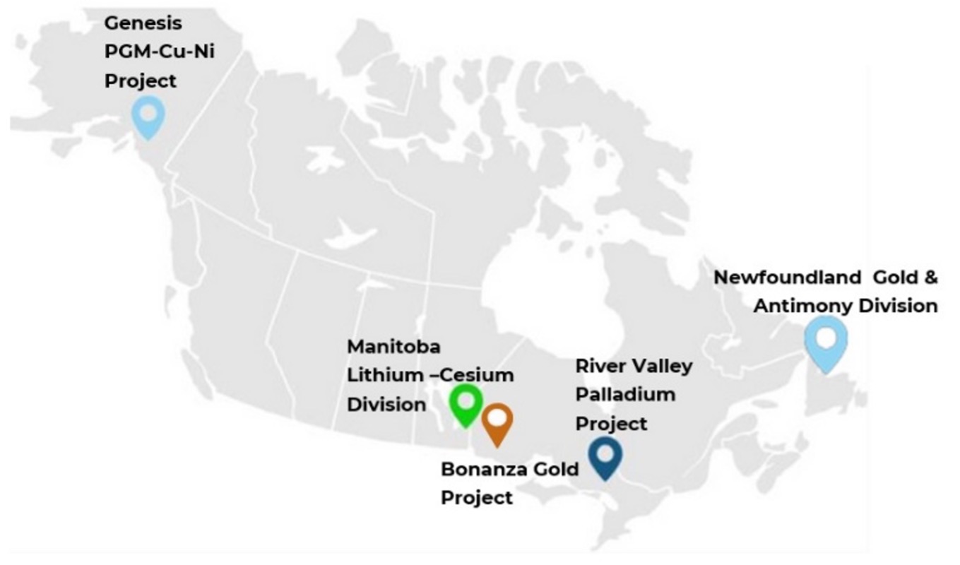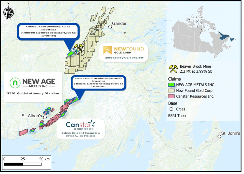 This early-stage portfolio, covering 19,300 ha, includes 12 gold-antimony projects in Newfoundland and Labrador. The claims are strategically located near New Found Gold’s (TSXV: NFG) Queensway project, and along strike of the past-producing Beaver Brook antimony mine.