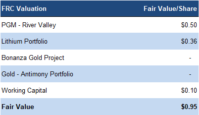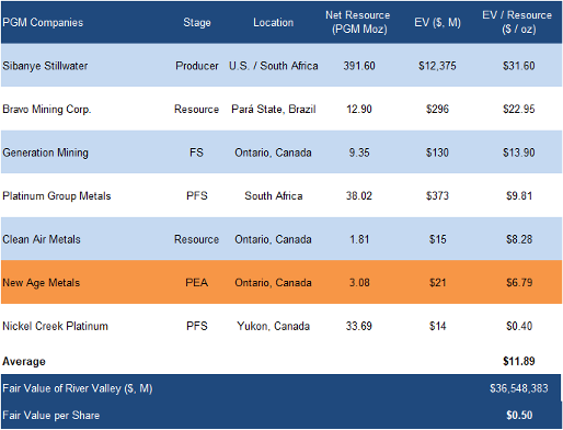 Using NAM’s River Valley resource and the average EV/oz, our estimated fair value is $0.50/share for the project