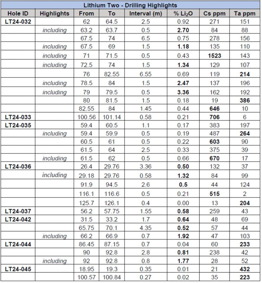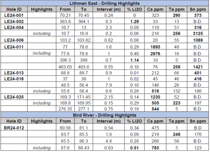 Drilling on Lithium Two, Bird River, and Lithman East returned 158 pegmatite intersections from 41 of 56 holes
