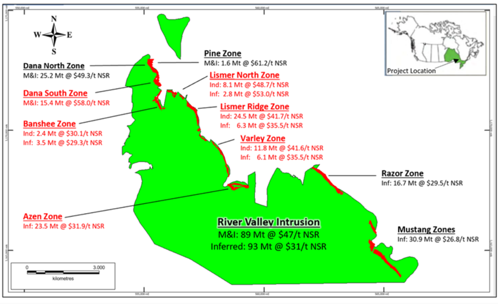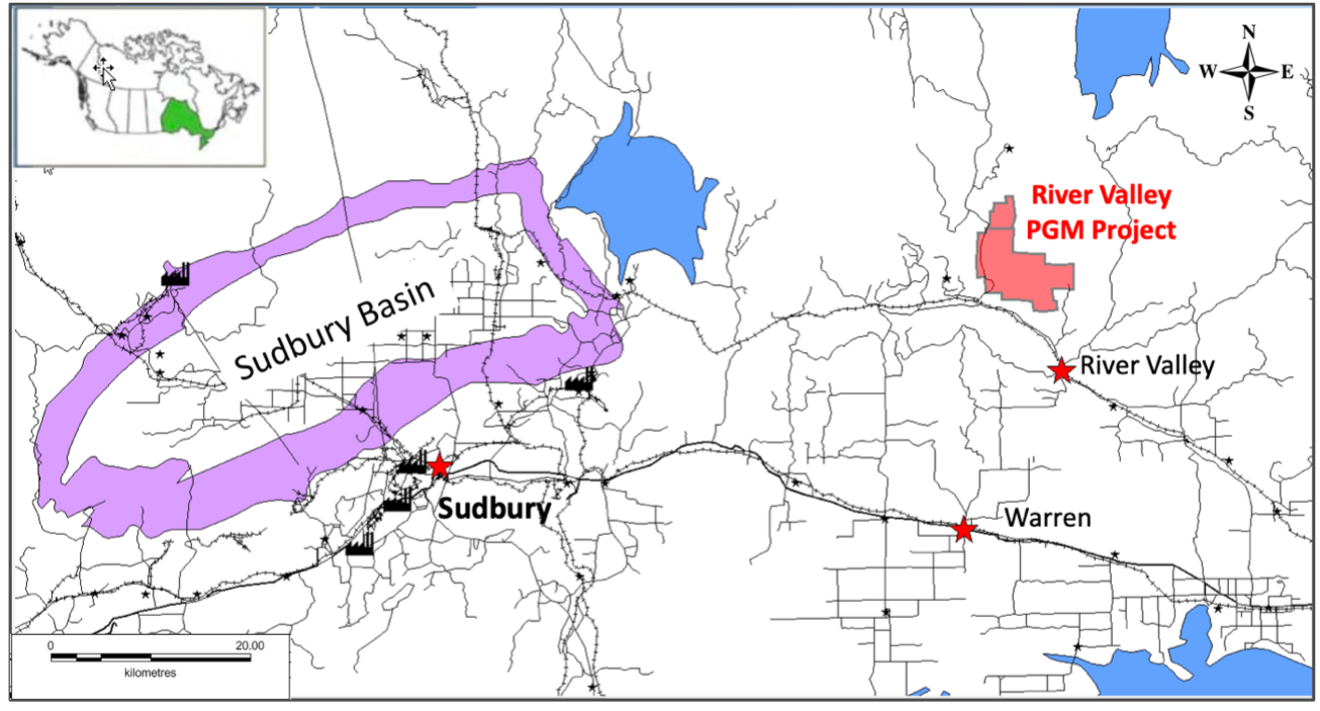 This advanced-stage project spans 107 km² in Sudbury, a world-class Ni-Cu- PGM mining district, with major processing facilities.