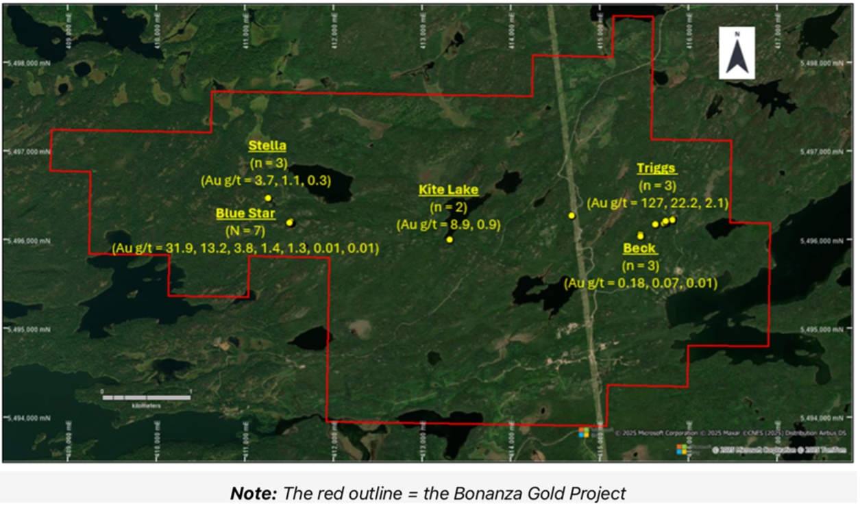 Exploration has identified five prospects across 4 km of the project area. Recent sampling confirmed gold mineralization at the Triggs, Kite Lake, Stella, and Blue Star prospects.