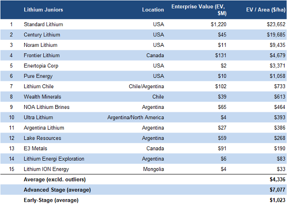 Early-stage lithium projects are trading at an Enterprise Value (EV) of $690/ha on average