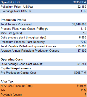 The PEA returned an After Tax-NPV5% of $140M, and a low AT-IRR of 11%, using US$2,150/oz palladium vs the spot price of US$1,425/oz (break-even: US$1,750/oz