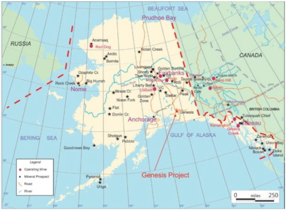 This drill-ready project, covering 4,144 hectares (10,240 acres) of mining claims, is located 460 km south of Fairbanks, Alaska.