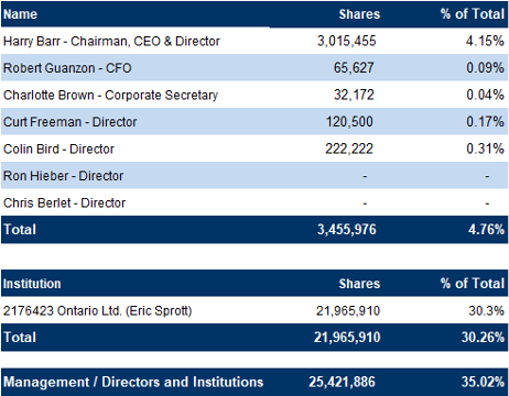 Eric Sprott is the largest shareholder, holding 30% of outstanding equity