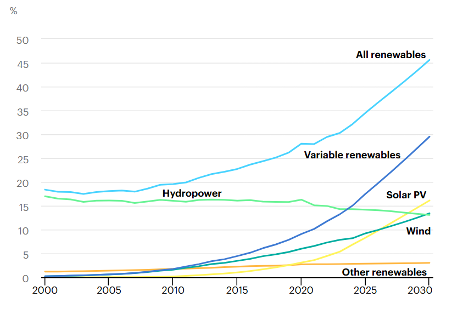 The share of renewables in total electricity generation is expected to rise from the current 35% to over 46% by 2030