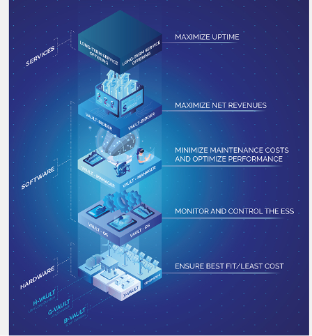 The diagram illustrates NRGV’s complete ecosystem, integrating proprietary hardware (B-Vault, G-Vault, H-Vault), with a multi-layered software platform