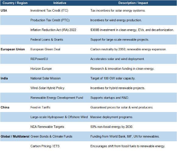 Governments worldwide are driving renewable energy through tax incentives, funding programs, and large-scale deployment policies, e.g., US ITC/PTC, EU Green Deal, India’s National Solar Mission, and China’s feed-in tariffs