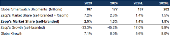 Zepp ranks seventh in global smartwatch sales, behind Apple, Samsung, Garmin, Fitbit/Google, Xiaomi, and Huawei. For perspective, Apple ships ~25M units annually; Zepp ships ~2–3M