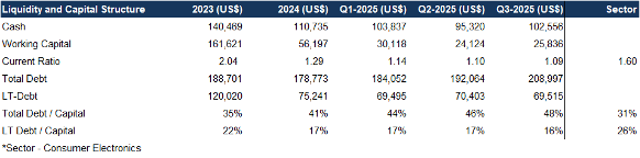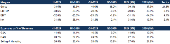 Gross margins fell 2 pp YoY, weighed down by lower-margin entry-level products like the Amazfit Bip 6 and Active 2, missing our estimate by 0.7 pp, and below the 44% average for leading wearables