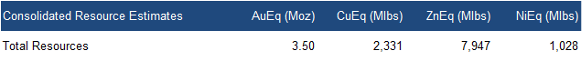 Combined resources of 3.50 Moz AuEq or 2.33 Blbs CuEq across four projects