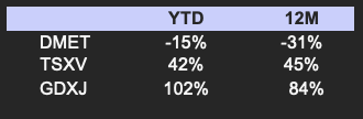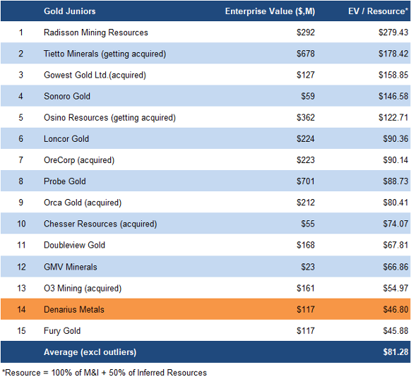 DMET is trading at C$47/oz (unchanged) vs the sector average of C$81/oz (previously C$62/oz