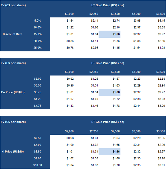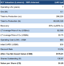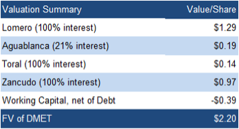 Our DCF (NAV) valuation fell from C$2.55/share to C$2.20/share, mainly due to share dilution, partly offset by higher metal price forecasts