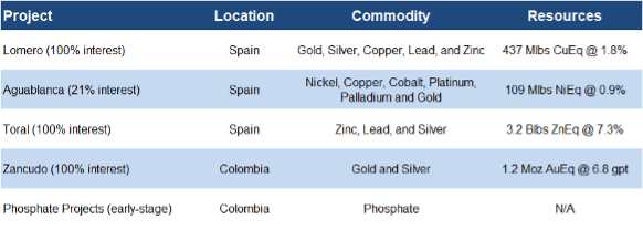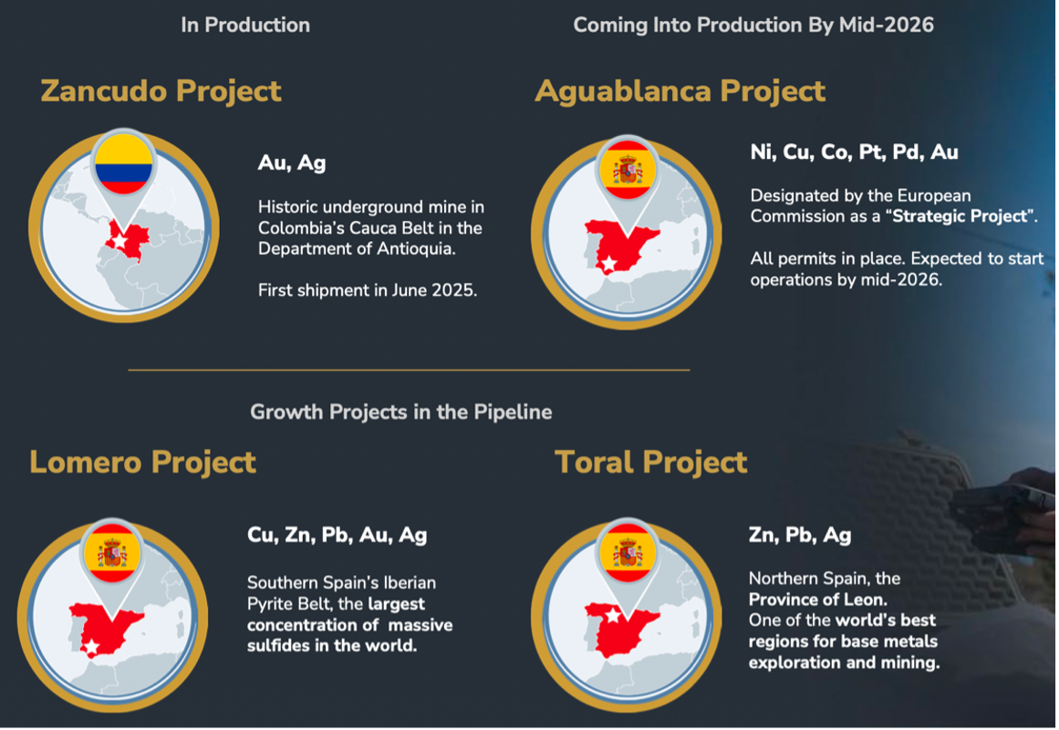 Portfolio of four polymetallic projects, with Zancudo in pre-production, and Aguablanca positioned for near-term production