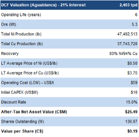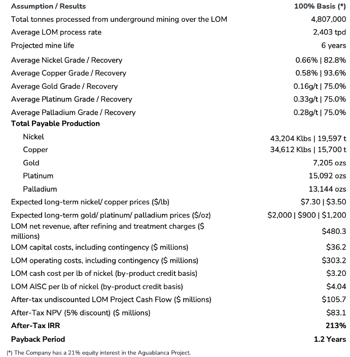 AT-NPV5% of $83M, and a very high AT-IRR of 213%, using $7.30/lb Ni (spot: $6.56/lb), and $3.50/lb Cu (spot: $4.98/lb Cu)