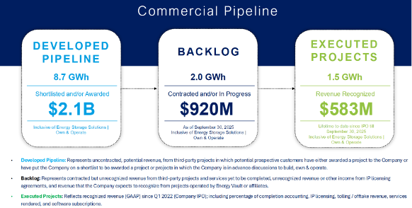 Significantly expanded project pipeline: By the end of Q3, NRGV had deployed 1.5 GWh (Q2: 1.1 GWh), with 2.0 GWh in contracted backlog (Q2: 2.4 GWh), and 8.7 GWh in pipeline (Q2: 5.9 GWh)