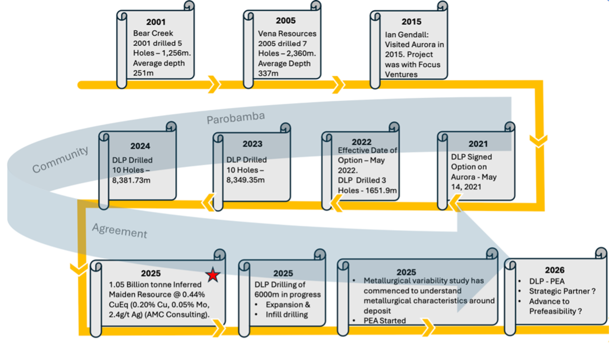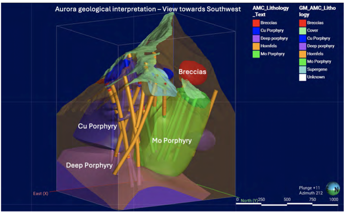 The flagship Aurora project hosts a large copper-molybdenum-silver porphyry deposit, suitable for open-pit mining.
