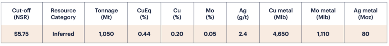 Resources (1.1 km long x 0.95 km wide x 1.0 km deep) are spread across two primary zones: a copper-rich zone, and a molybdenum-rich zone