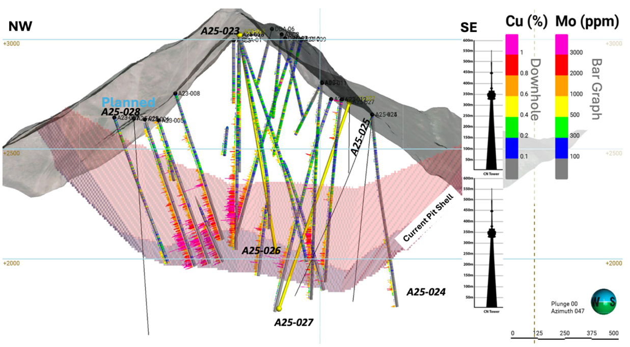 Initial results from the ongoing 6,000–7,000 m drill program returned strong copper, silver, and molybdenum grades, including 130 m at 0.50% CuEq, within a broader 927 m interval at 0.31% CuEq, suggesting potential to expand the resource envelope ~180 m to the southwest, and ~300 m to the southeast.