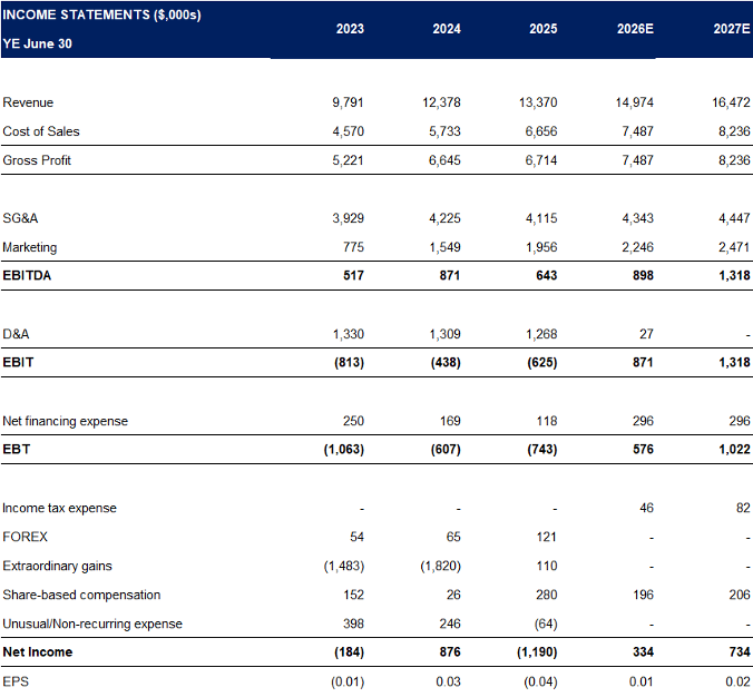 We are reiterating our BUY rating, while adjusting our fair value estimate from $0.77 to $0.73/share (the average of our DCF and comparables valuations). Valuation metrics suggest DHB remains modestly priced relative to peers. We believe DHB is well-positioned for growth through its strong distribution network, and planned M&A. Robust organic growth is expected, supported by rising awareness of sleep’s role in health, and expansion into new geographic markets.