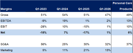 Gross margins fell 4 pp, missing our estimate by 2 pp; management cited channel, customer, and product mix, though details were not disclosed. We will monitor whether the decline is temporary or longer-term