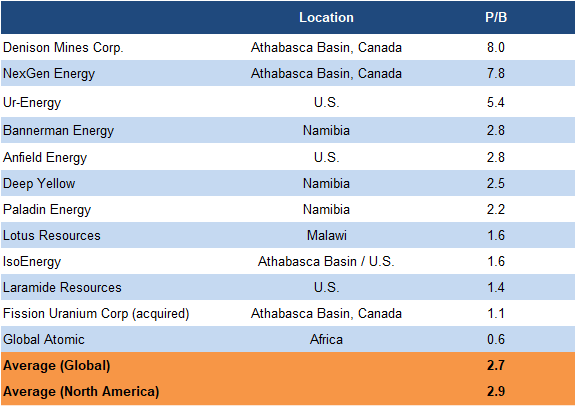 North American uranium juniors are trading at 2.9x book value (previously 2.7x)