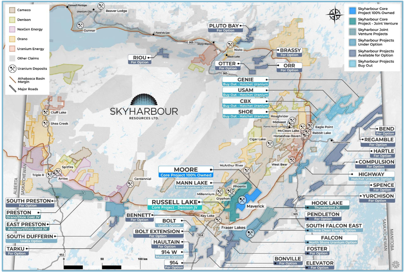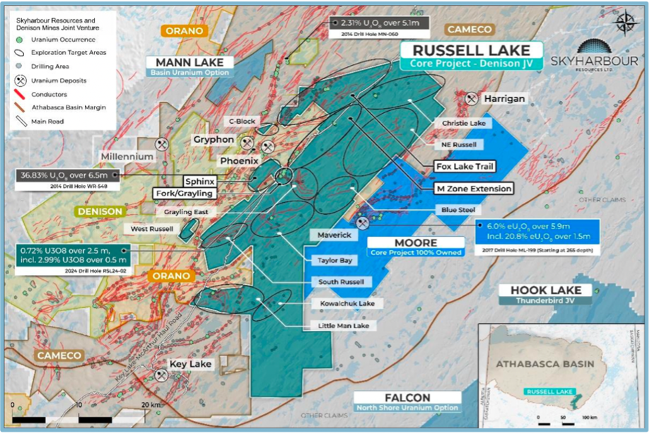 Russell Lake is strategically located between SYH’s Moore uranium project, and Denison’s Wheeler River project, and close to Cameco’s (TSX: CCO) Key Lake mill, and MacArthur River mines
