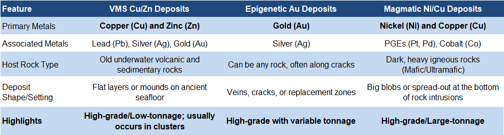 A brief overview of VMS deposits: Copper sulfides form in the hotter, central parts of VMS systems, while zinc sulfides occur farther out. VMS deposits often occur in clusters (1–20 Mt) , and collectively they can form major mining districts or camps. Canada hosts three major VMS camps: Flin Flon–Snow Lake (Saskatchewan–Manitoba), Bathurst (New Brunswick), and Noranda (Quebec). Smaller deposits (<4 Mt) are usually found from surface to ~300 m depth, whereas larger deposits (>10 Mt) commonly extend to depths of 1,000–2,000 m.