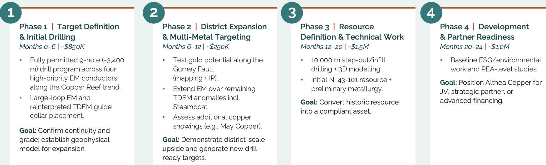Management is focused on confirming the Copper Reef mineralization , and exploring opportunities to expand the existing mineralized envelope. Upcoming work will include further geophysical surveys , and an initial nine hole/3,400 m drill program ( pending permits ) at four high-priority targets along the Copper Reef trend .