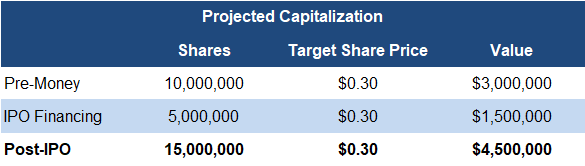 Applying the sector average, we estimate a pre-IPO valuation of $0.45/share, and a post-IPO valuation of $0.40/share, assuming IPO financing at $0.30/share