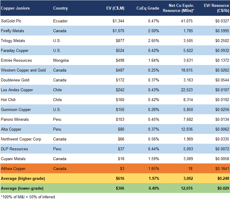At the IPO financing price of $0.30/share, Althea’s historic resources are valued at $0.16/lb, compared with a sector average of $0.25/lb for high-grade copper juniors, a 34% discount